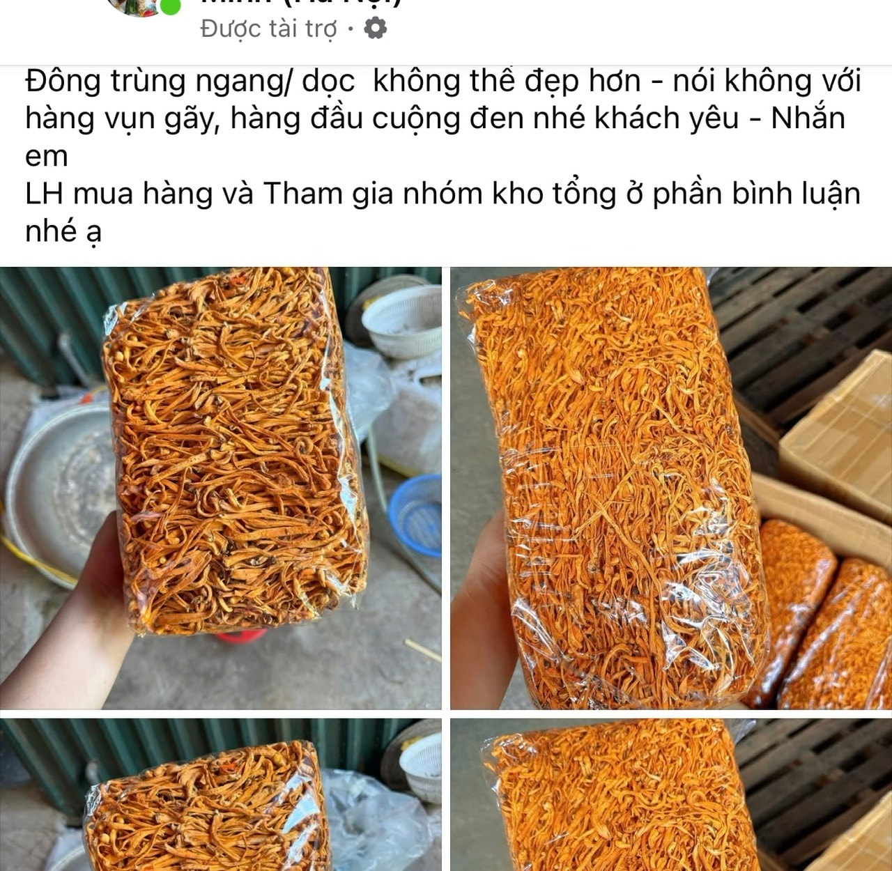 Chỉ cần vào Facebook, người dùng không khó để bắt gặp hàng loạt trang và hội nhóm rao bán đông trùng hạ thảo với những lời quảng cáo đầy mê hoặc như “đông trùng hạ thảo thượng hạng”, “giá gốc tại trại nuôi”, “bồi bổ sức khỏe, tăng đề kháng, phòng chống ung thư”… với đủ mức giá rẻ đến khó tin. Điểm chung đáng lo ngại của các sản phẩm này là không có nhãn mác và chưa được kiểm định chất lượng.