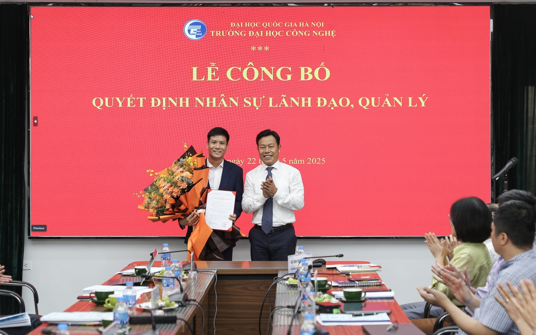 Bí thư Đảng ủy, Giám đốc ĐHQGHN Lê Quân (phải) trao Quyết định điều động và chỉ định đồng chí Lê Trung Thành giữ chức Bí thư Đảng ủy Trường Đại học Công nghệ nhiệm kỳ 2020 - 2025. Ảnh: VNU