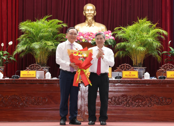 Đồng chí Đồng Văn Thanh tặng hoa chúc mừng tân Phó Chủ tịch UBND TP Cần Thơ Lê Công Lý.