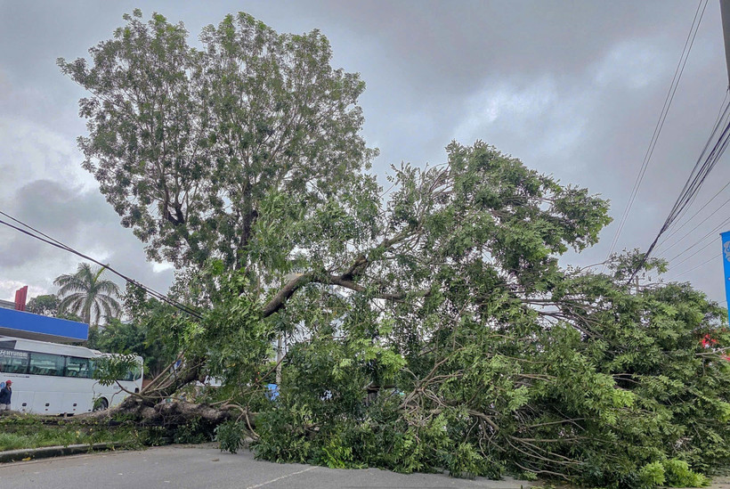 Cây xà cừ cao hơn 20m bật gốc chắn ngang đường Cách Mạng Tháng Tám (phường Bình Thủy, thành phố Cần Thơ) ngày 12/11. (Ảnh: TTXVN phát)