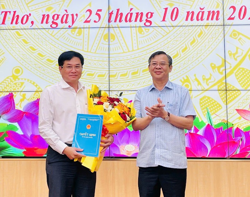 Ông Trương Cảnh Tuyên, Chủ tịch UBND TP. Cần Thơ (bên phải) trao quyết định cho ông Nguyễn Trọng Sơn. Ảnh: CanTho Portal
