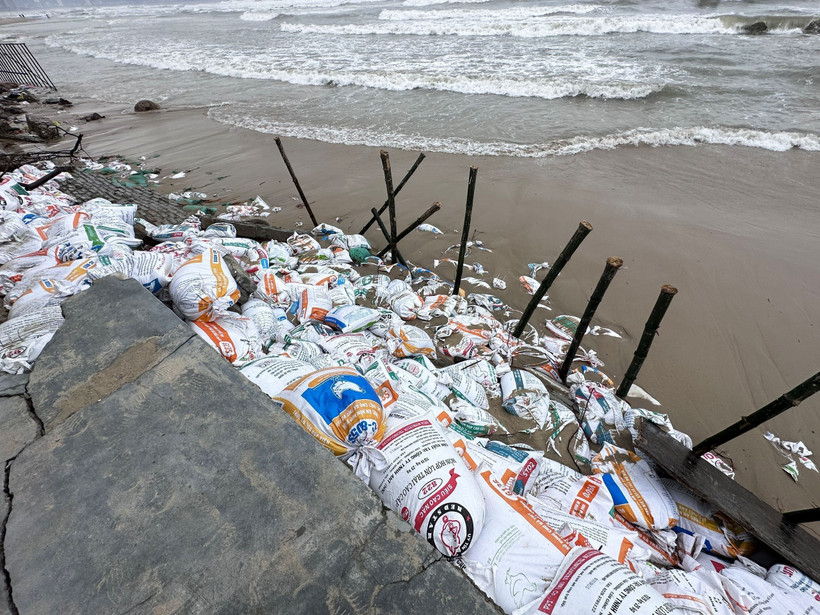 Các bao cát được chèn vào các khu vực nước biển xâm thực để hạn chế sạt lở. (Ảnh minh họa: Trần Lê Lâm/TTXVN)