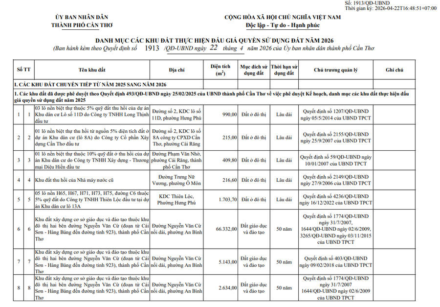 UBND TP Cần Thơ vừa ban hành kế hoạch tổ chức đấu giá quyền sử dụng đất năm 2026, với mục tiêu khai thác hiệu quả quỹ đất công, tăng nguồn thu ngân sách và thúc đẩy phát triển kinh tế - xã hội địa phương.