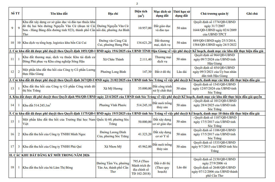 Danh mục các khu đất thực hiện đấu giá trong năm 2026.