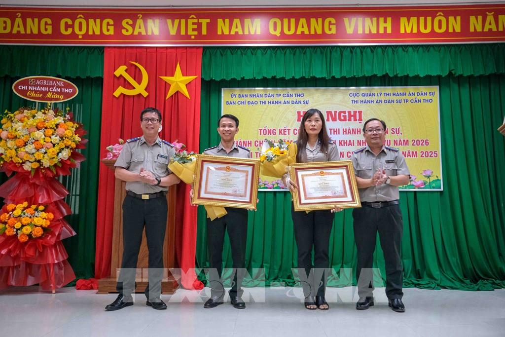 Lãnh đạo Thi hành án dân sự thành phố Cần Thơ trao Bằng khen của Thủ tướng Chính phủ cho hai cá nhân thuộc Thi hành án dân sự thành phố. Ảnh: Thanh Liêm - TTXVN