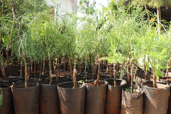 Những cây giống thủy tùng được trồng trong chậu sau khi ghép khoảng 1 năm mới tiến hành trồng dưới đất. (Ảnh: Thu Hiền/TTXVN)