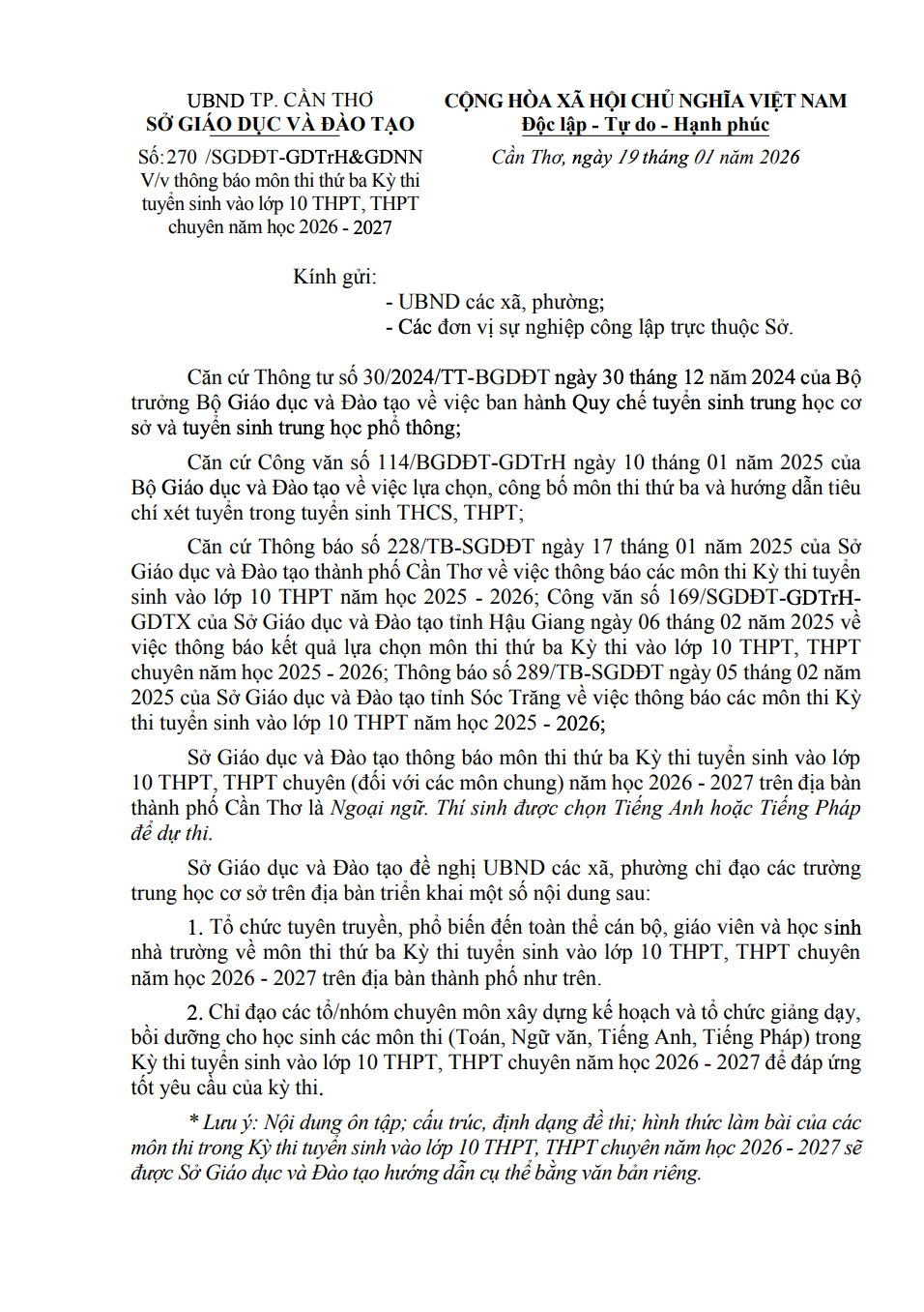 Thông báo chọn Ngoại ngữ là môn thi thứ 3 vào lớp 10 tại Cần Thơ.