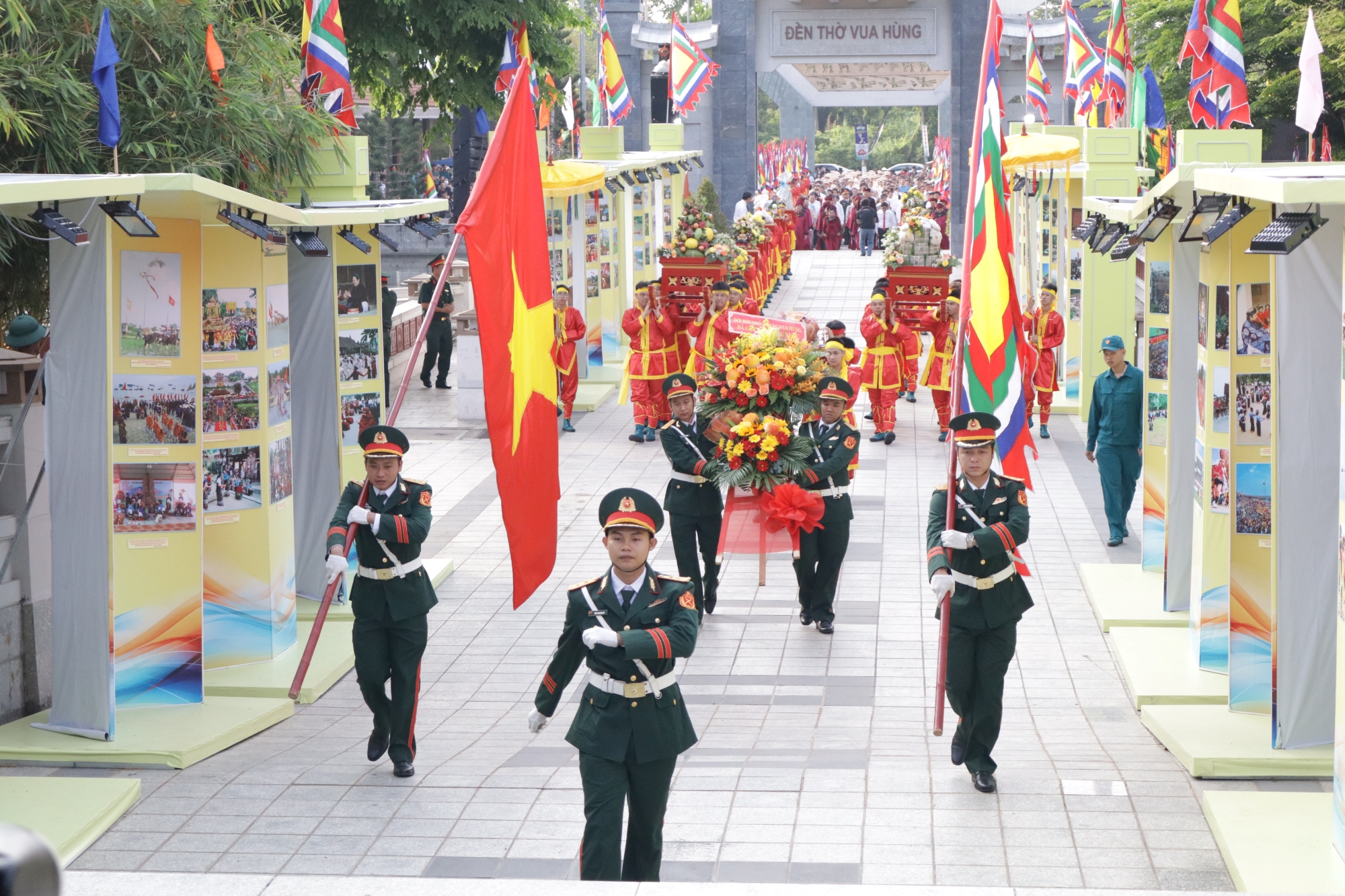 Đội nghi lễ đang tiến vào Đền Thờ Vua Hùng. Ảnh: NHẪN NAM
