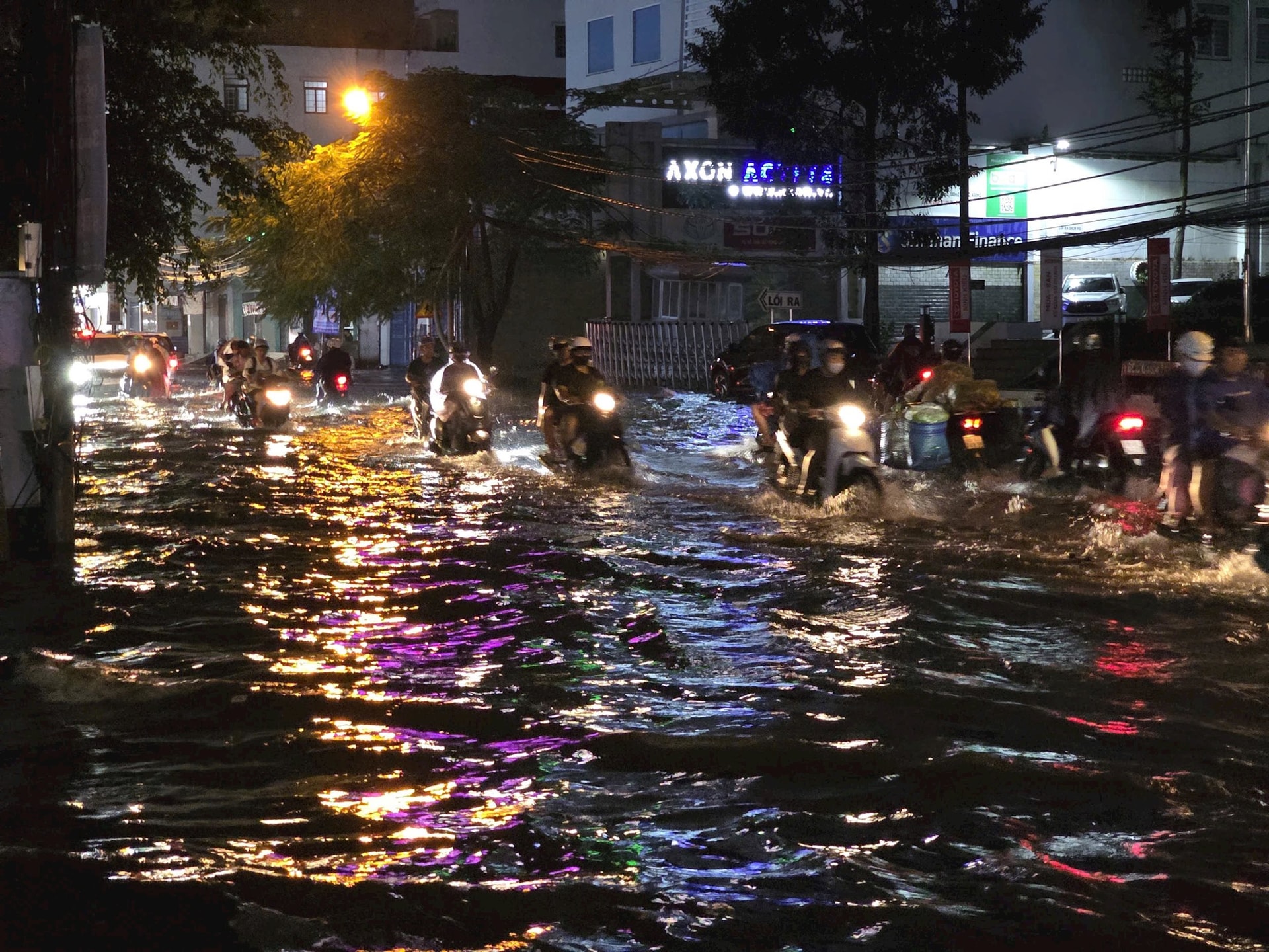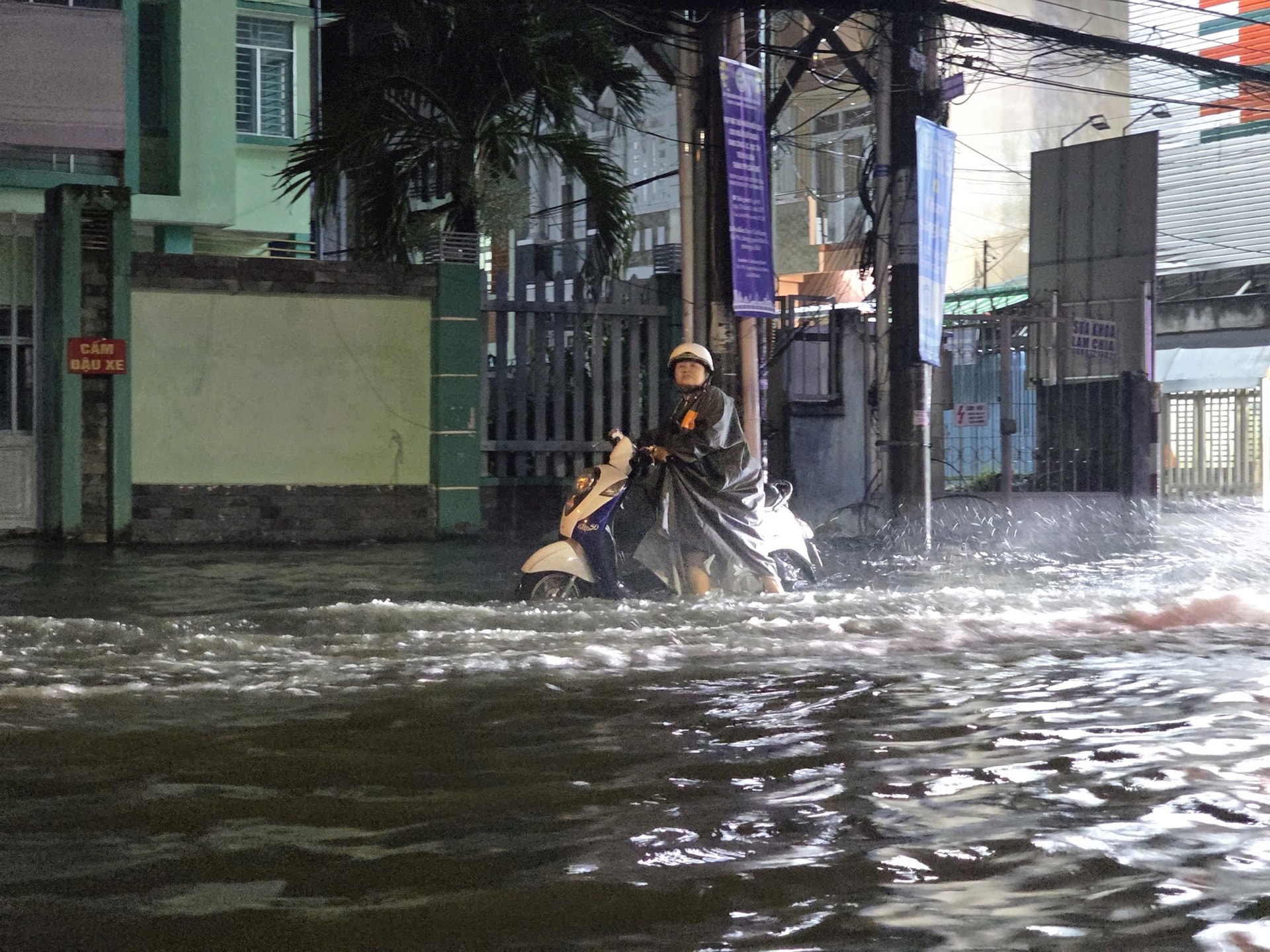 Đến hơn 22 giờ, mưa vẫn tiếp tục trút xuống và chưa có dấu hiệu giảm bớt. Nhiều tuyến đường vẫn chìm trong nước, gây nguy hiểm cho người tham gia giao thông.