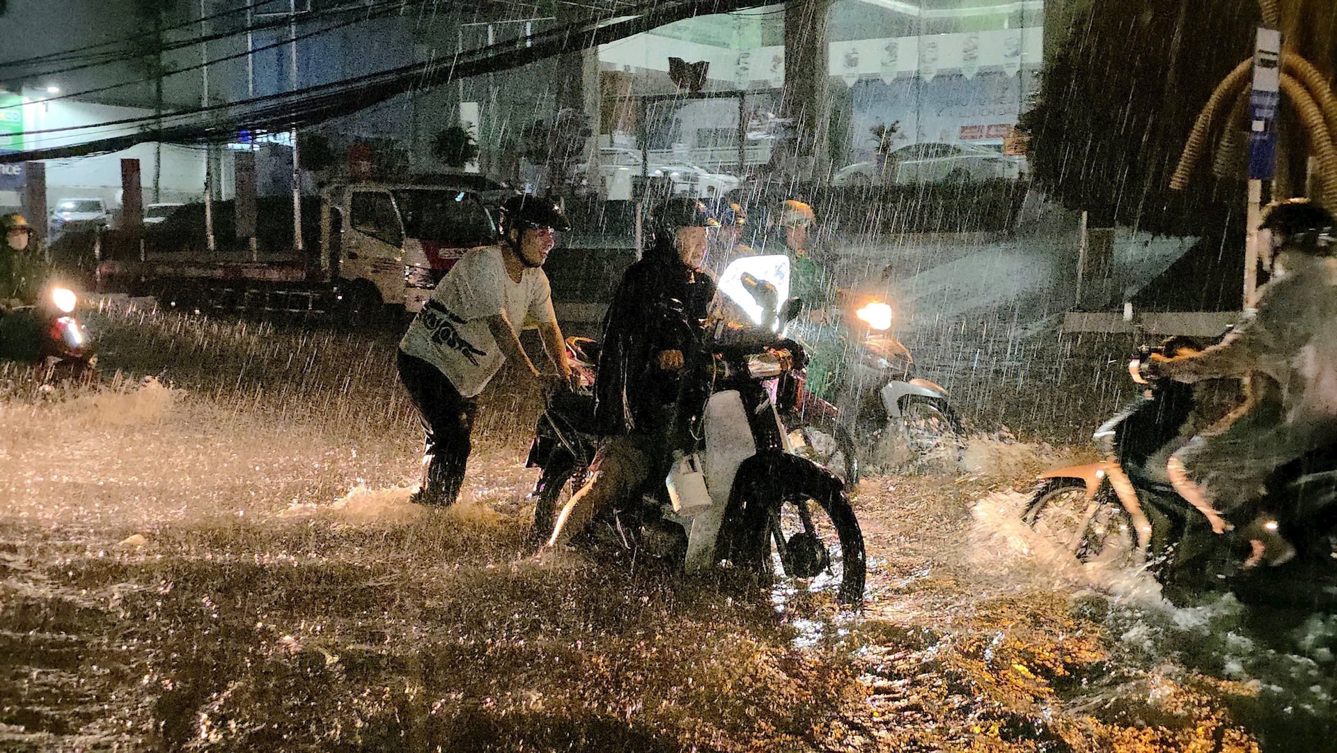 Mưa lớn khiến xe máy liên tục chết máy, người dân phải dắt bộ trong mưa.