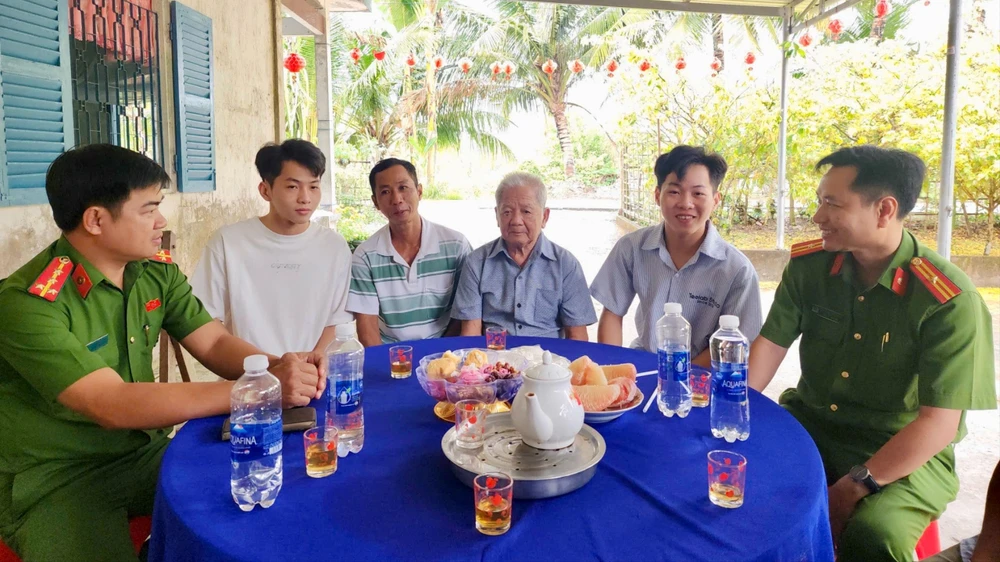 Cán bộ Công an xã Thạnh Hòa, TP Cần Thơ động viên gia đình hai anh em Đào Hoàng Ca và Đào Sơn Ca. Ảnh: Hải Dương