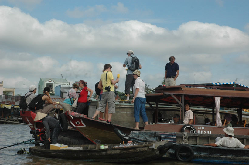 Du khách nước ngoài tham quan chợ nổi Cái Răng, Cần Thơ.