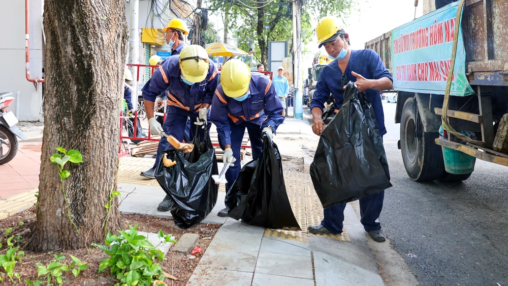 Ngay sau lễ ra quân, các lực lượng đã tiến hành thu gom rác, cắt tỉa cây xanh, dọn dẹp vệ sinh... trên địa bàn phường Tân An. Ảnh: CHÂU ANH