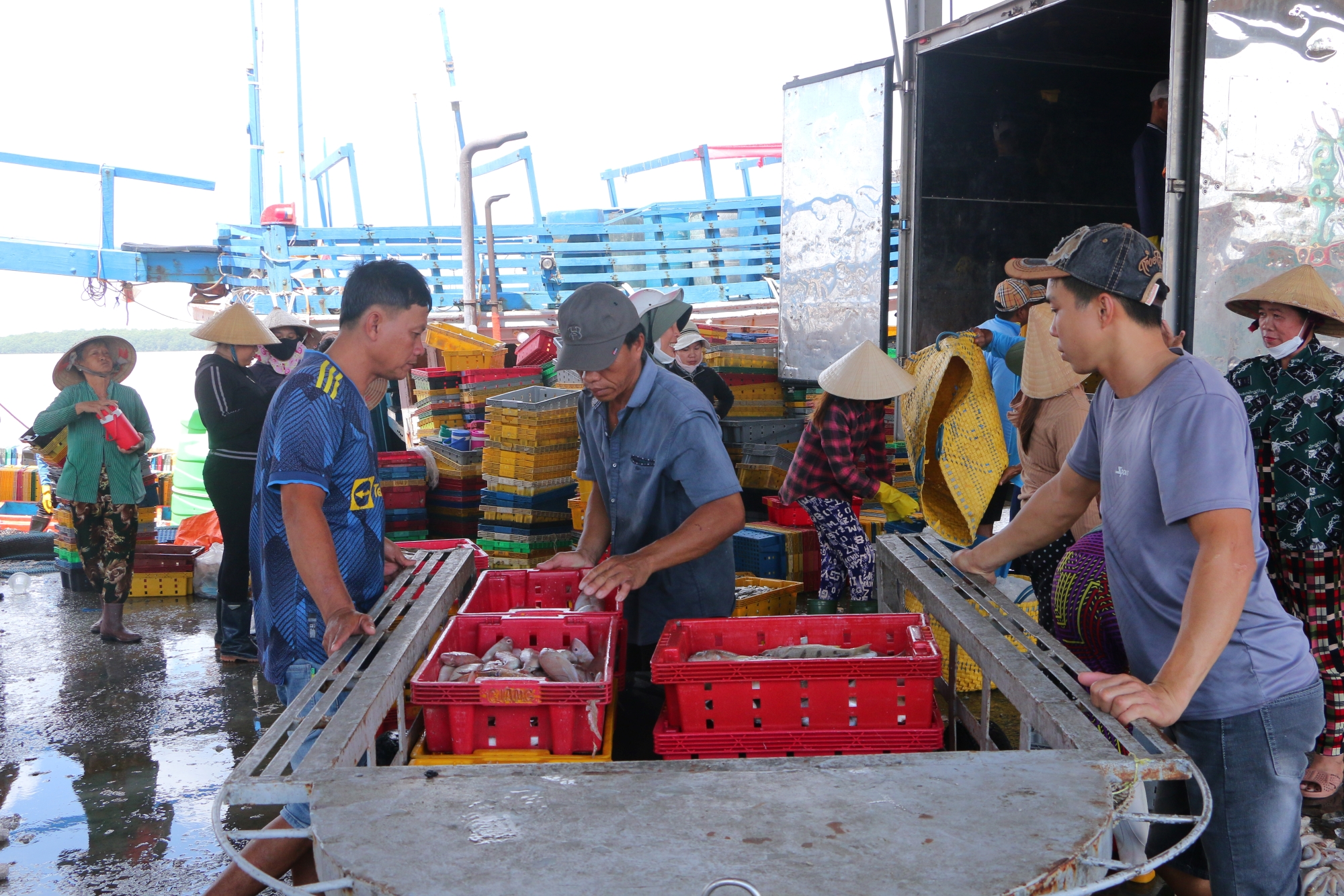 Thu hoạch cá về bờ tại cảng cá Trần Đề. Ảnh: NH