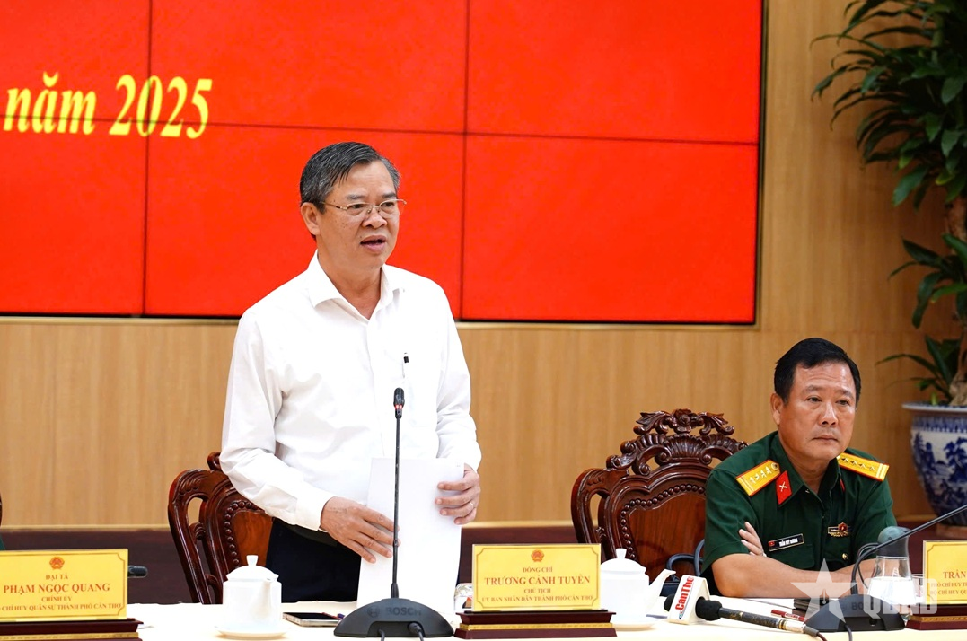 Đồng chí Trương Cảnh Tuyên, Chủ tịch UBND, Chủ tịch Hội đồng nghĩa vụ quân sự TP Cần Thơ chủ trì hội nghị.