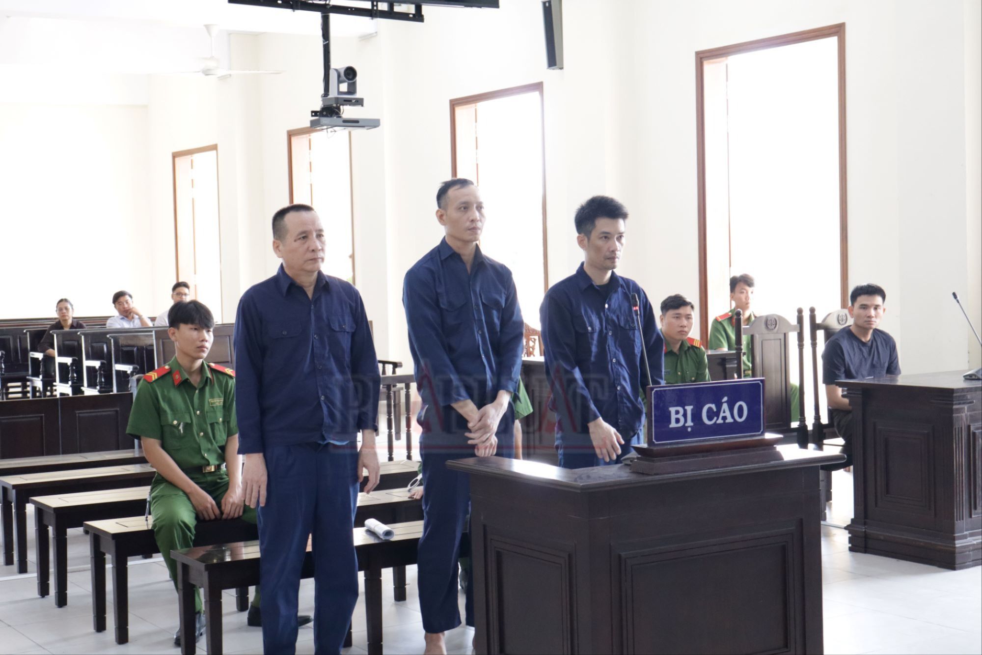 Các bị cáo Trần Văn Phúc, Trương Văn Tiên, Trần Ngọc Trung tại phiên tòa. Ảnh: NHẪN NAM