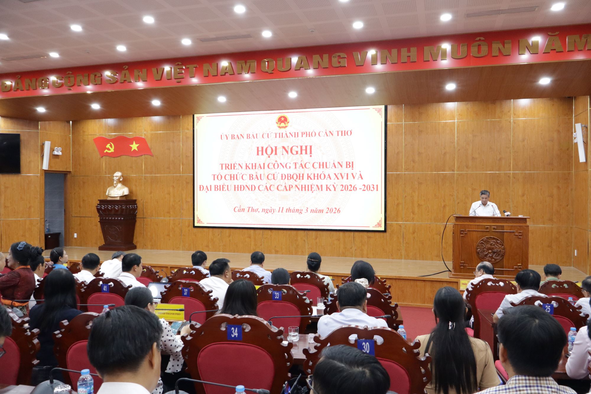 Hội nghị triển khai công tác chuẩn bị tổ chức bầu cử đại biểu Quốc hội khóa (ĐBQH) XVI và đại biểu HĐND các cấp nhiệm kỳ 2026-2031 ở Cần Thơ. Ảnh: NHẪN NAM