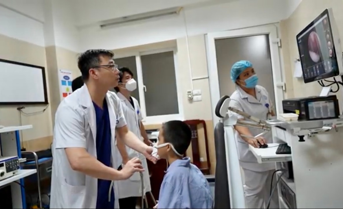 Bác sĩ Bệnh viện Tai - Mũi - Họng trung ương nội soi gắp dị vật cho bệnh nhi 7 tuổi. Ảnh: BVCC