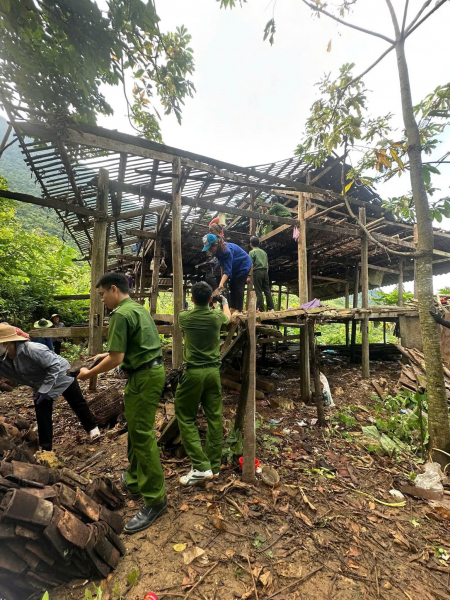 Công an xã Cần Yên hỗ trợ người dân dỡ, dựng nhà mới.