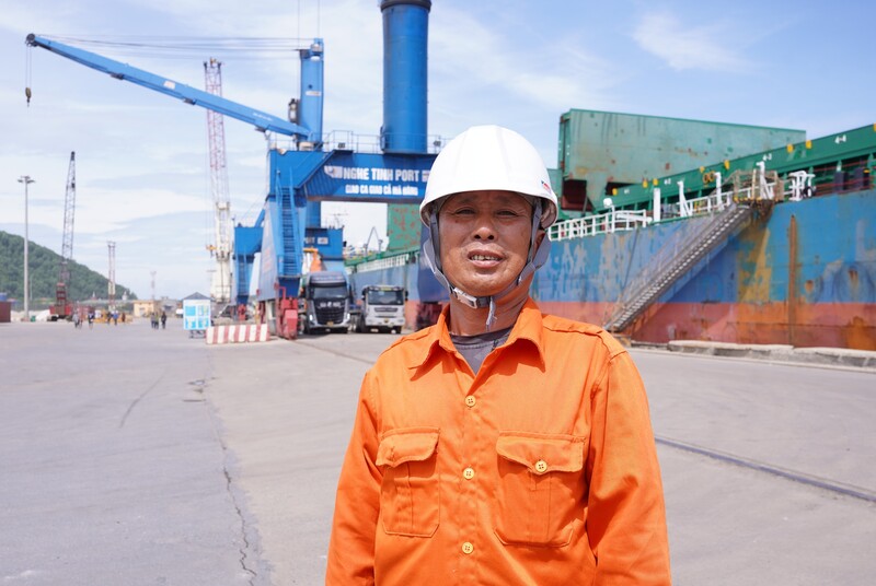 Anh Trần Thanh Hoan, công nhân Cảng Cửa Lò cho biết, người lao động phấn khởi khi đi làm trở lại trong những ngày đầu năm mới và mong muốn năm 2026, sản lượng hàng thông qua cảng đạt kế hoạch đề ra, thu nhập của người lao động tiếp tục được nâng lên. Ảnh: Mai Liễu