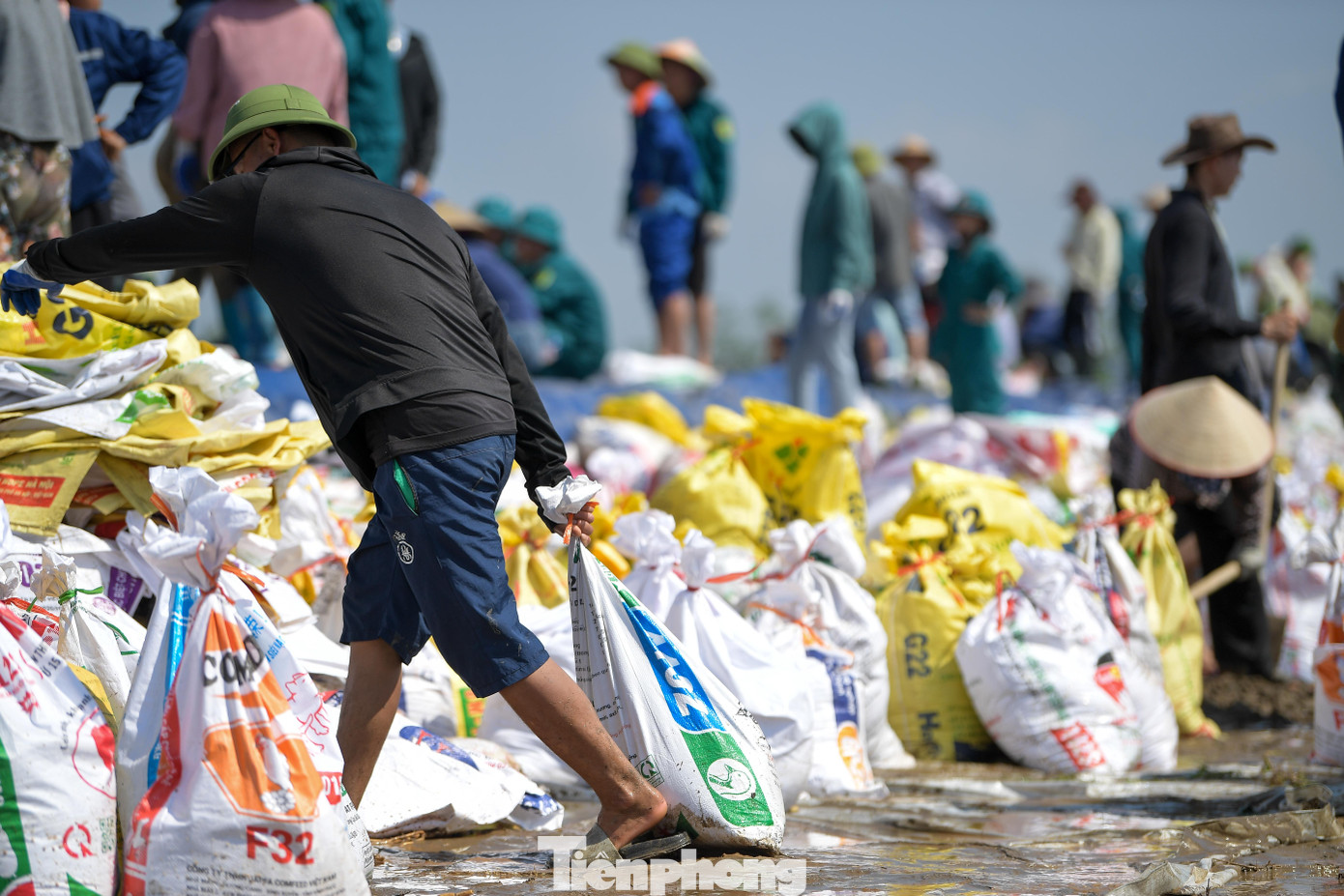 Hàng trăm người dân, đoàn viên và lực lượng chức năng túc trực trên tuyến đê Đẩu Hàn trưa 9/10.
