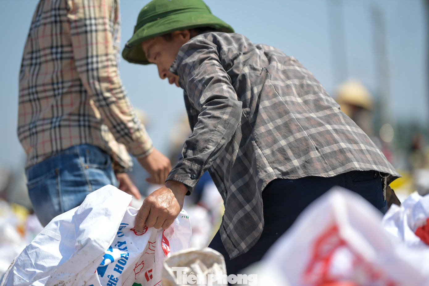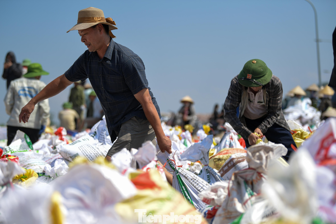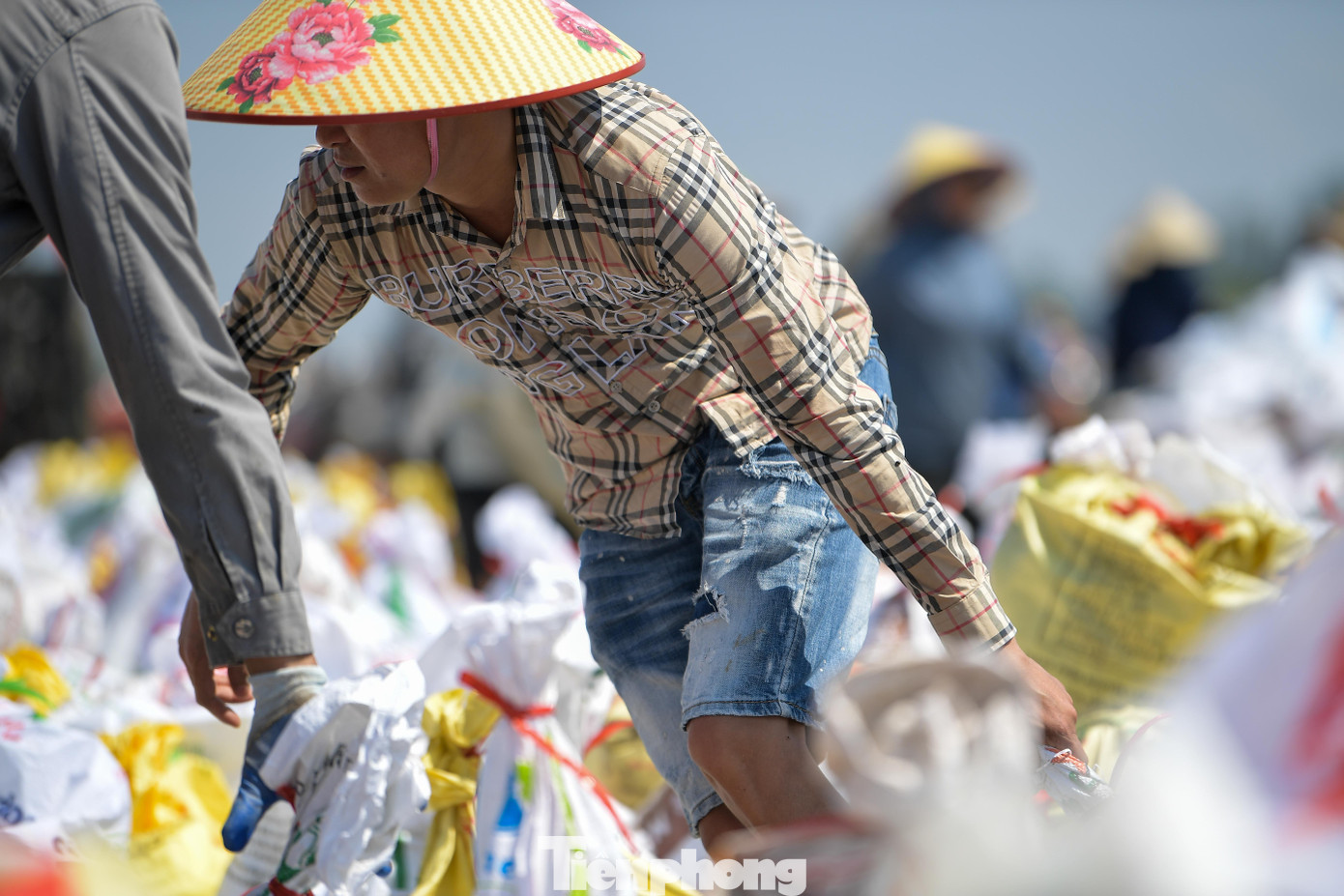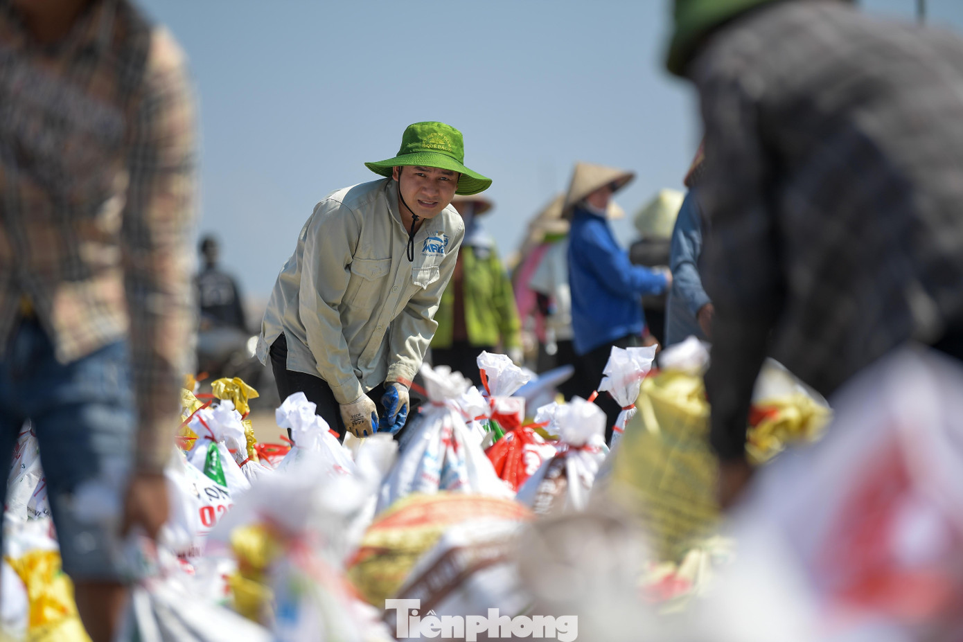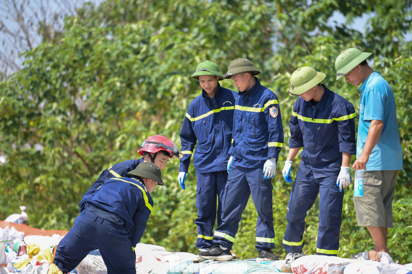 Dưới nắng gắt, các đoàn viên thanh niên tiếp tục vận chuyển cát, bao tải và vật liệu lên đê.