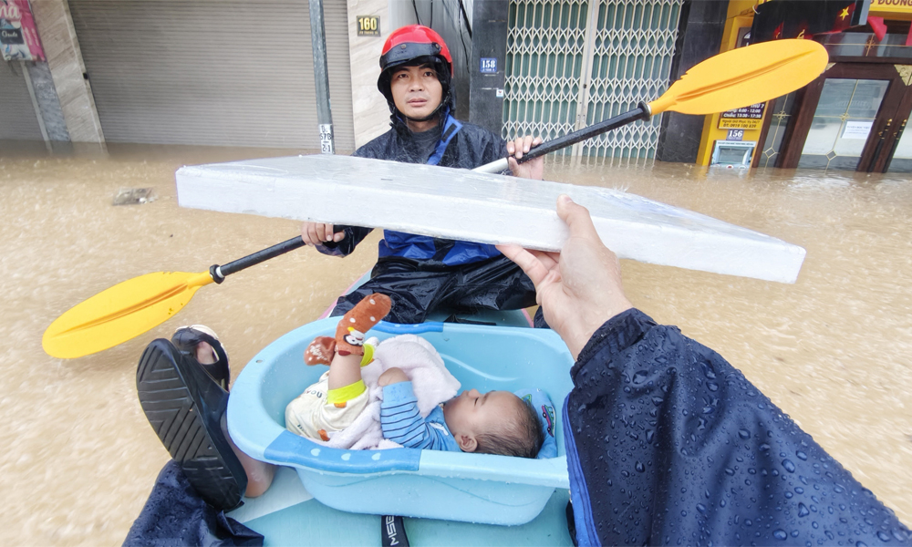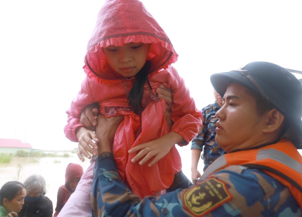 Hỗ trợ sơ tán trẻ em trong khu dân cư bị ngập lụt ở phường Tây Nha Trang (Khánh Hòa).