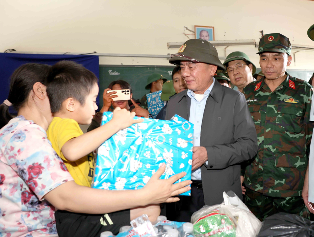 Phó Thủ tướng Thường trực Nguyễn Hòa Bình tặng quà cho người dân vùng lũ.