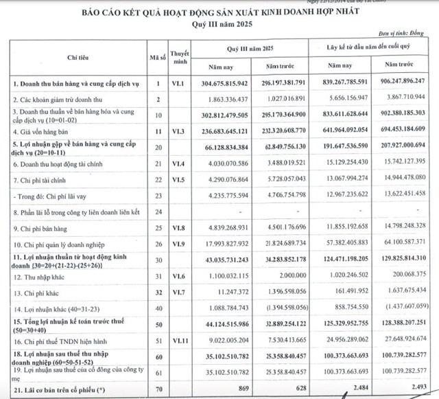 Trong đó, quý III/2025, doanh nghiệp ghi nhận doanh thu thuần đạt 302,8 tỷ đồng, tăng 3% so với cùng kỳ.