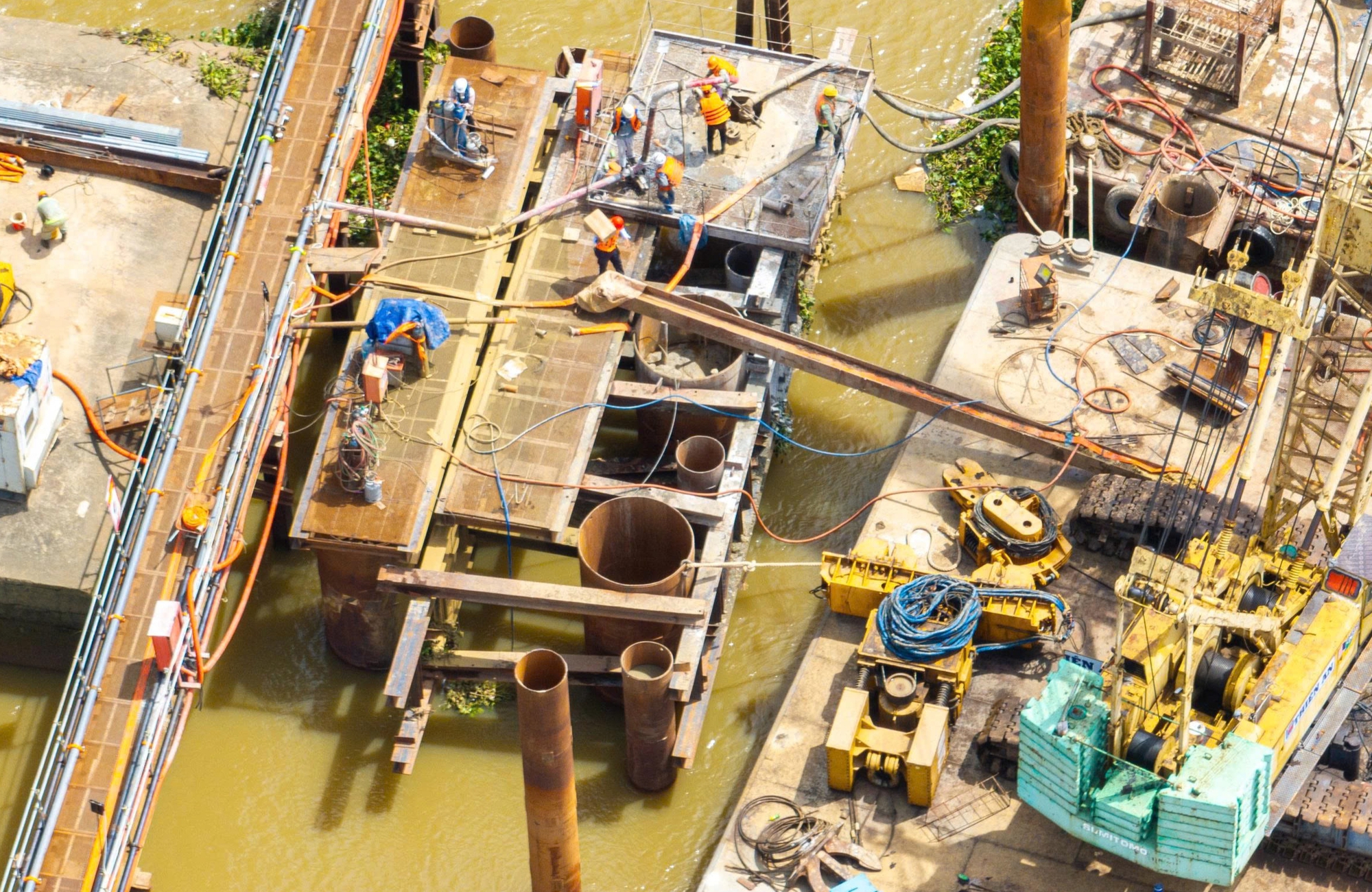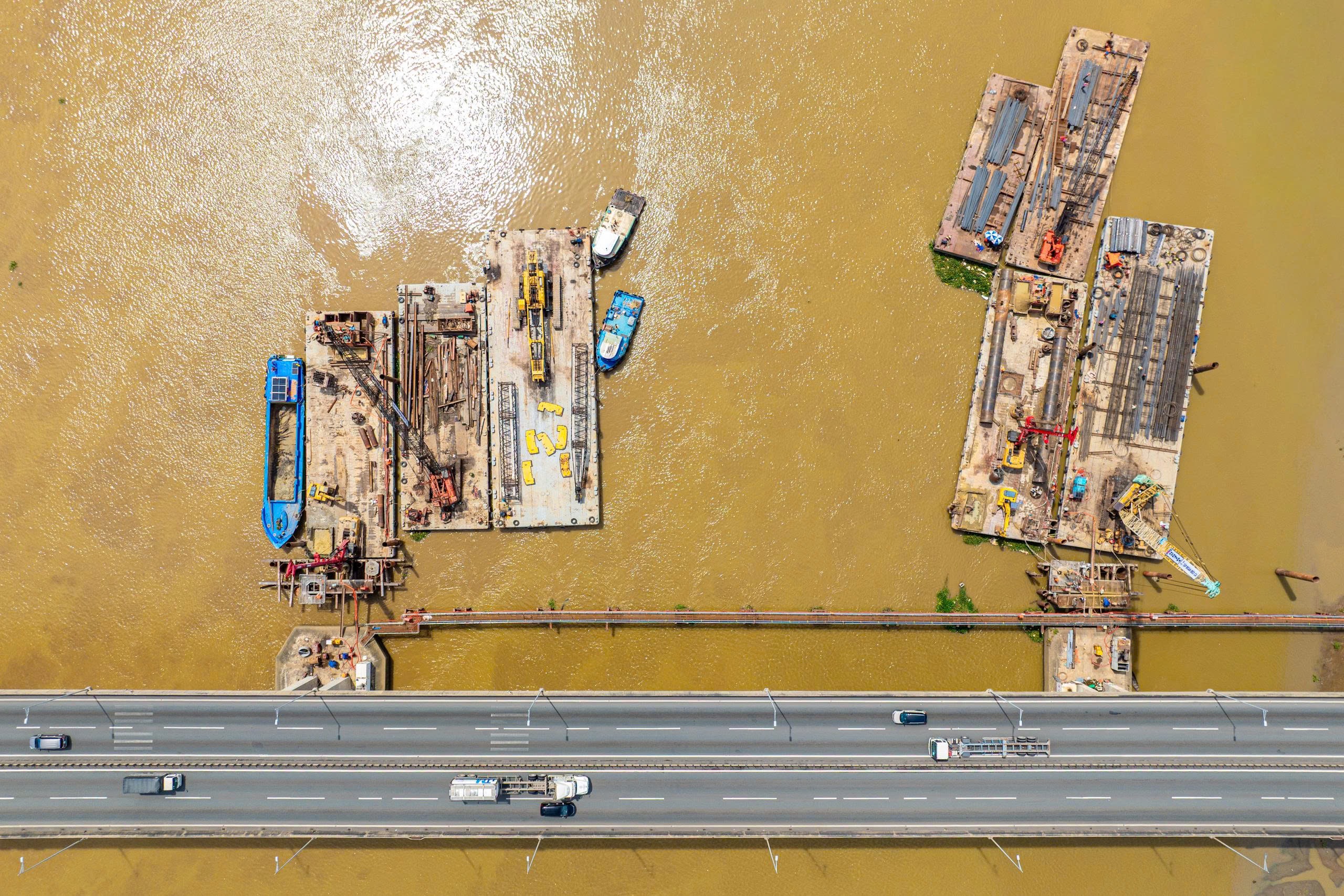 Giữa lòng sông, những sà lan chở vật liệu neo đậu san sát, cần cẩu vươn cao giữa màn sương sớm, liên tục xoay trục nâng hạ những khối sắt thép nặng hàng chục tấn. Từng đợt bê tông được vận chuyển bằng ống dẫn dài, bơm sâu xuống đáy sông, hình thành những trụ móng vững chắc cho cây cầu Long Thành mới hạng mục được xem là đường găng quyết định tiến độ toàn dự án.
