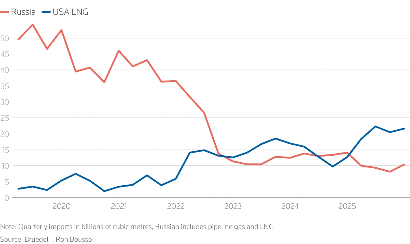 EU đã giải quyết bài toán trước mắt bằng cách thay thế một sự phụ thuộc bằng một sự phụ thuộc khác. Khi tỷ trọng khí đốt Nga trong nhập khẩu của EU giảm từ 45% xuống còn 12% vào năm ngoái, châu Âu nhanh chóng chuyển sang khí tự nhiên hóa lỏng (LNG) từ Mỹ. Nhập khẩu LNG Mỹ tăng vọt từ 18 triệu tấn năm 2021 lên 65 triệu tấn năm 2025, chiếm 57% tổng lượng LNG mà EU và Anh nhập khẩu. Hiện Mỹ cung cấp gần một phần tư tổng lượng khí đốt nhập khẩu của EU.