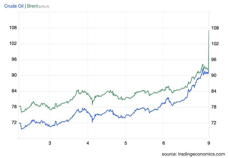 Giá dầu Brent và dầu thô Mỹ đã tăng vọt, có thời điểm vượt 110 USD/thùng.