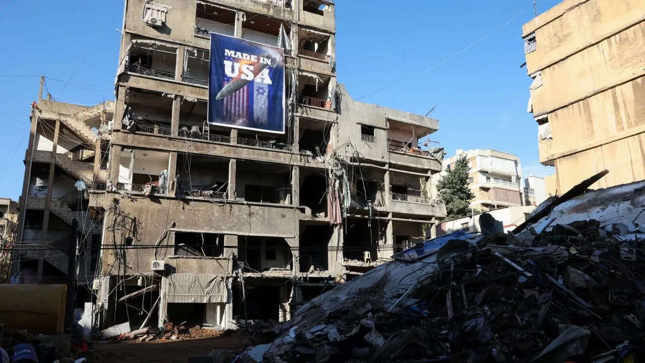 Biểu ngữ mang dòng chữ “Made in USA” treo trên một tòa nhà bị hư hại tại quận Chiyah, vùng ngoại ô phía Nam thủ đô Beirut, Liban, ngày 28/11/2024. Ảnh: Reuters.