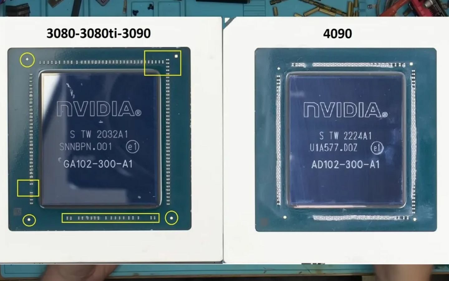 Chiếc card đồ họa này sở hữu phần lõi và các chip RAM hoàn toàn là giả hoặc đã hỏng. Những kẻ lừa đảo đã sử dụng kỹ thuật mài mòn lớp bề mặt chip gốc để xóa bỏ thông tin cũ, sau đó sử dụng máy khắc laser chuyên dụng để in đè các thông số kỹ thuật của RTX 4090 lên trên. Các mã hiệu chuyên dụng như AD102-300-A1 cùng logo Nvidia được thực hiện chuẩn xác đến mức mắt thường khó lòng phân biệt.