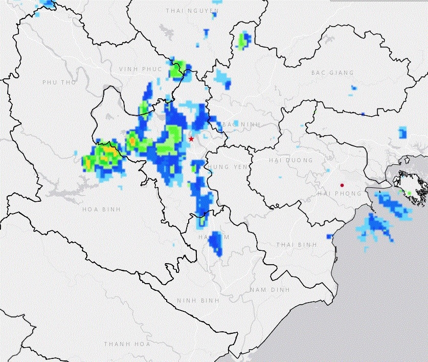 Theo dõi từ ảnh vệ tinh, số liệu định vị dông sét và ra đa thời tiết, trong khoảng 3 giờ qua, một vùng mây đối lưu đang phát triển mạnh và gây mưa tại các khu vực Yên Xuân, Phú Cát và Hòa Lạc. Khối mây này hiện có xu hướng di chuyển và mở rộng về phía khu vực nội thành thành phố Hà Nội.