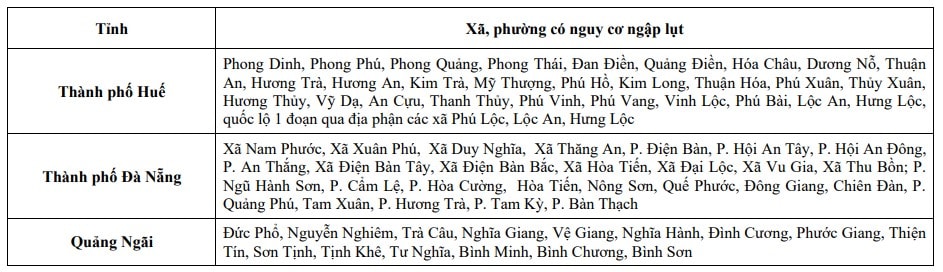 Trung tâm Dự báo khí tượng thủy văn Quốc gia cảnh báo, ngập lụt sâu, diện rộng tại thành phố Huế, thành phố Đà Nẵng, ngập lụt cục bộ tại tỉnh Quảng Ngãi; nguy cơ cao xảy ra lũ quét trên các sông suối và sạt lở đất trên các sườn dốc các tỉnh từ Quảng Trị đến Quảng Ngãi.