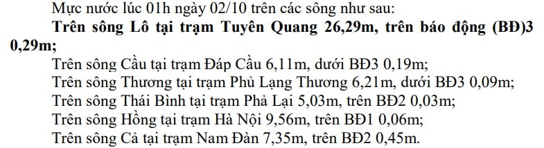 Theo đó, hiện nay (2/10), lũ trên sông Lô (Tuyên Quang), sông Cầu (Thái Bình), sông Thương (Bắc Ninh), sông Thái Bình (Hải Phòng) đang lên. Do ảnh hưởng vận hành điều tiết các hồ chứa thượng lưu và lũ thượng lưu, mực nước ở hạ lưu sông Hồng tại trạm Hà Nội đang lên chậm, lũ hạ lưu sông Cả (Nghệ An) ít biến đổi.