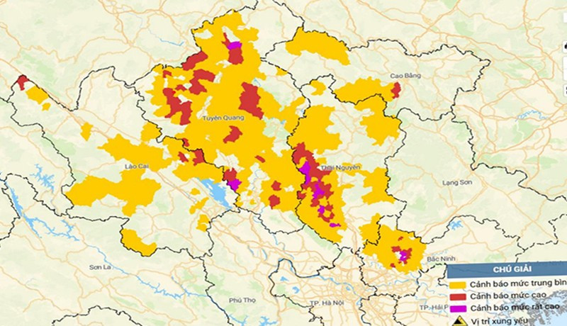 Cảnh báo cấp độ rủi ro thiên tai do lũ quét, sạt lở đất, sụt lún đất do mưa lũ hoặc dòng chảy: cấp 1; Thái Nguyên: cấp 2.