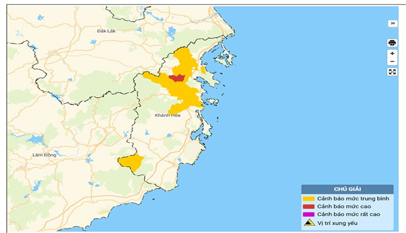 Bản đồ nguy cơ lũ quét, sạt lở đất đá trên khu vực Khánh Hòa.