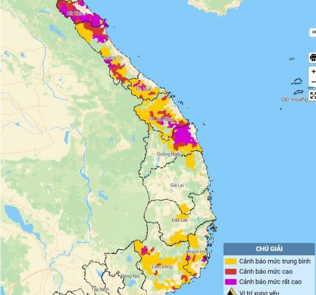 Tại TP. Đà Nẵng, các xã/phường có nguy cơ xảy ra lũ quét, sạt lở đất đá trong 6 giờ tới, bao gồm: Hiệp Đức, Lãnh Ngọc, Phước Hiệp, Phước Trà, Trà Liên, Trà My; Bà Nà, Bến Giằng, Đức Phú, Khâm Đức, Nông Sơn, Núi Thành, P. Hải Vân, P. Liên Chiểu, Quế Phước, Quế Sơn, Sơn Cẩm Hà, Tam Mỹ, Thạnh Bình, Tiên Phước, Trà Giáp, Trà Tân, Việt An; Avương, Bến Hiên, Chiên Đàn, Đắc Pring, Đại Lộc, Đồng Dương, Hà Nha, Hòa Tiến, Hòa Vang, Hùng Sơn, La Dêê, La Êê, Nam Giang, Nam Trà My, P. An Khê, P. Hòa Khánh, Phú Ninh, Phú Thuận, Phước Chánh, Phước Năng, Phước Thành, Quế Sơn Trung, Sông Kôn, Sông Vàng, Tam Anh, Tam Xuân, Tây Giang, Thăng Phú, Thạnh Mỹ, Thu Bồn, Thượng Đức, Trà Leng, Trà Tập, Trà Vân.
