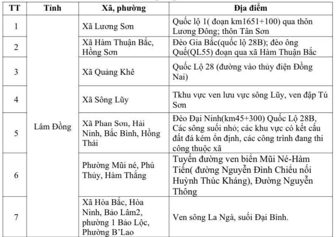 Nguy cơ xảy ra lũ quét trên các sông, suối nhỏ, sạt lở đất, sụt lún đất trên sườn đốc, đường đèo, taluy dương, các tuyến đường giao thông. Đặc biệt, trong số các xã, phường có khu vực nguy cơ lũ quét, sạt lở, sụt lún đất đá những giờ tới, có nhiều địa phương thuộc khu vực phía Đông tỉnh như: Xã Lương Sơn (Quốc lộ 1 qua thôn Lương Đông, thôn Tân Sơn); xã Hàm Thuận Bắc, Hồng Sơn (đèo ông Quế, Quốc lộ 55) đoạn qua xã Hàm Thuận Bắc; xã Sông Lũy (khu vực ven lưu vực sông Lũy, ven đập Tú Sơn); xã Phan Sơn, Hải Ninh, Phú Thủy, Hàm Thắng…