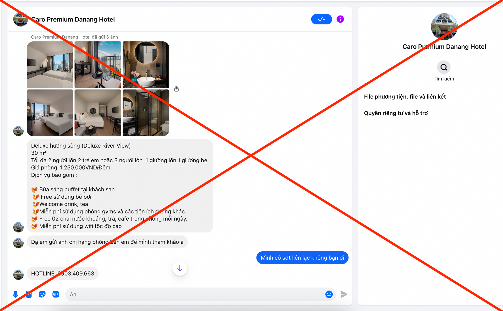 Chính chi tiết này khiến chị bắt đầu nghi ngờ và chủ động tra cứu thông tin khách sạn trên các kênh chính thức. Khi gọi trực tiếp đến quầy lễ tân, chị mới biết đơn vị không nhận đặt phòng qua mạng xã hội và không sử dụng tài khoản cá nhân để giao dịch.