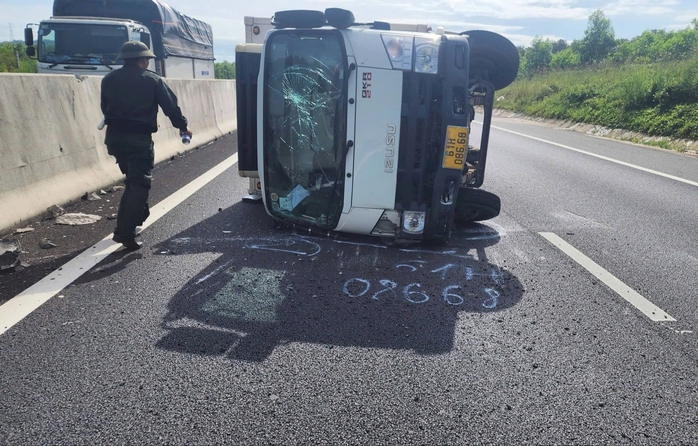 Xe tải bị lật ngang do nổ lốp.