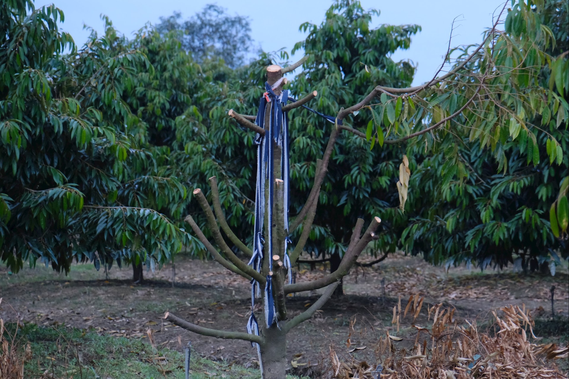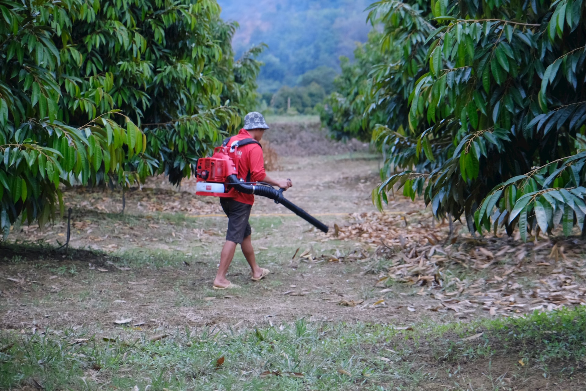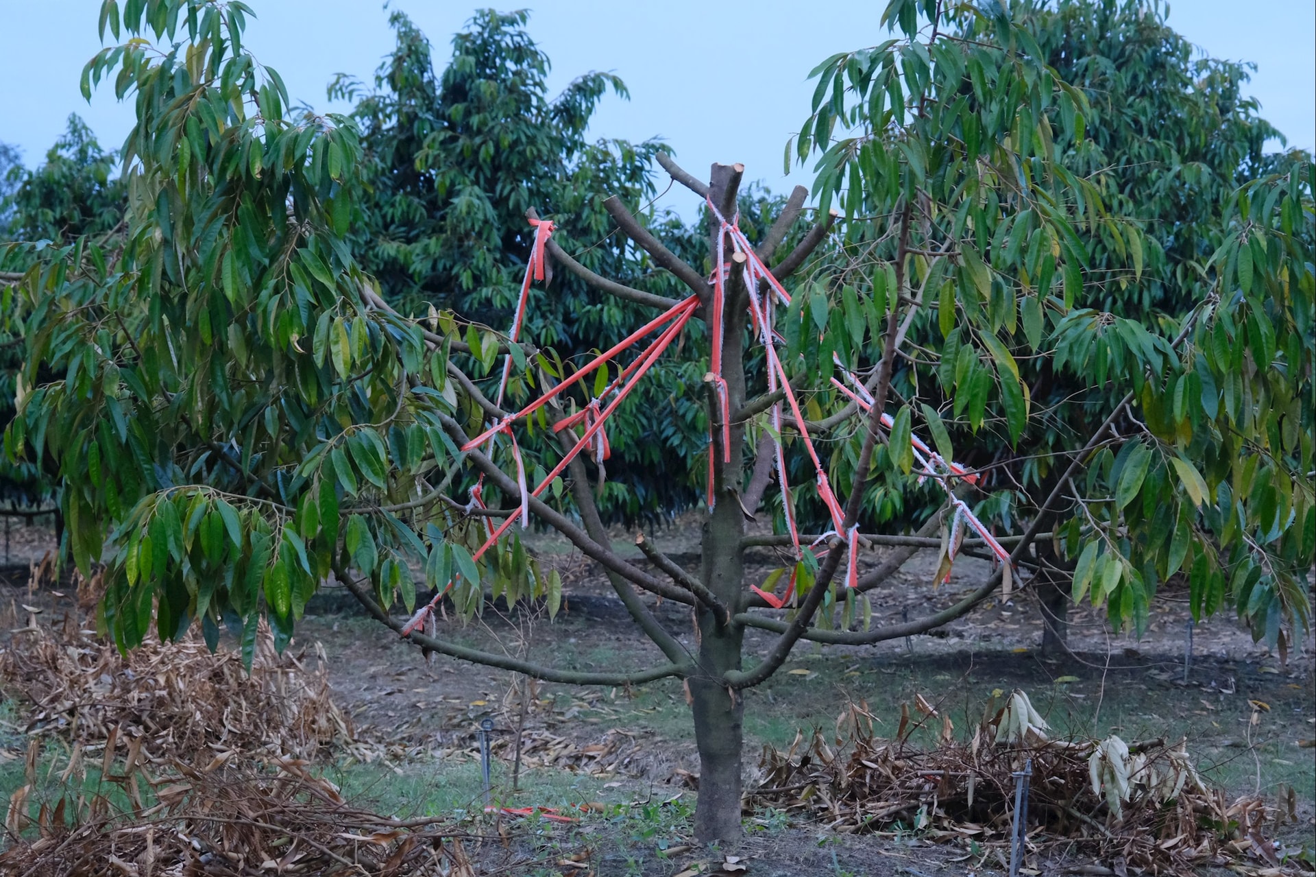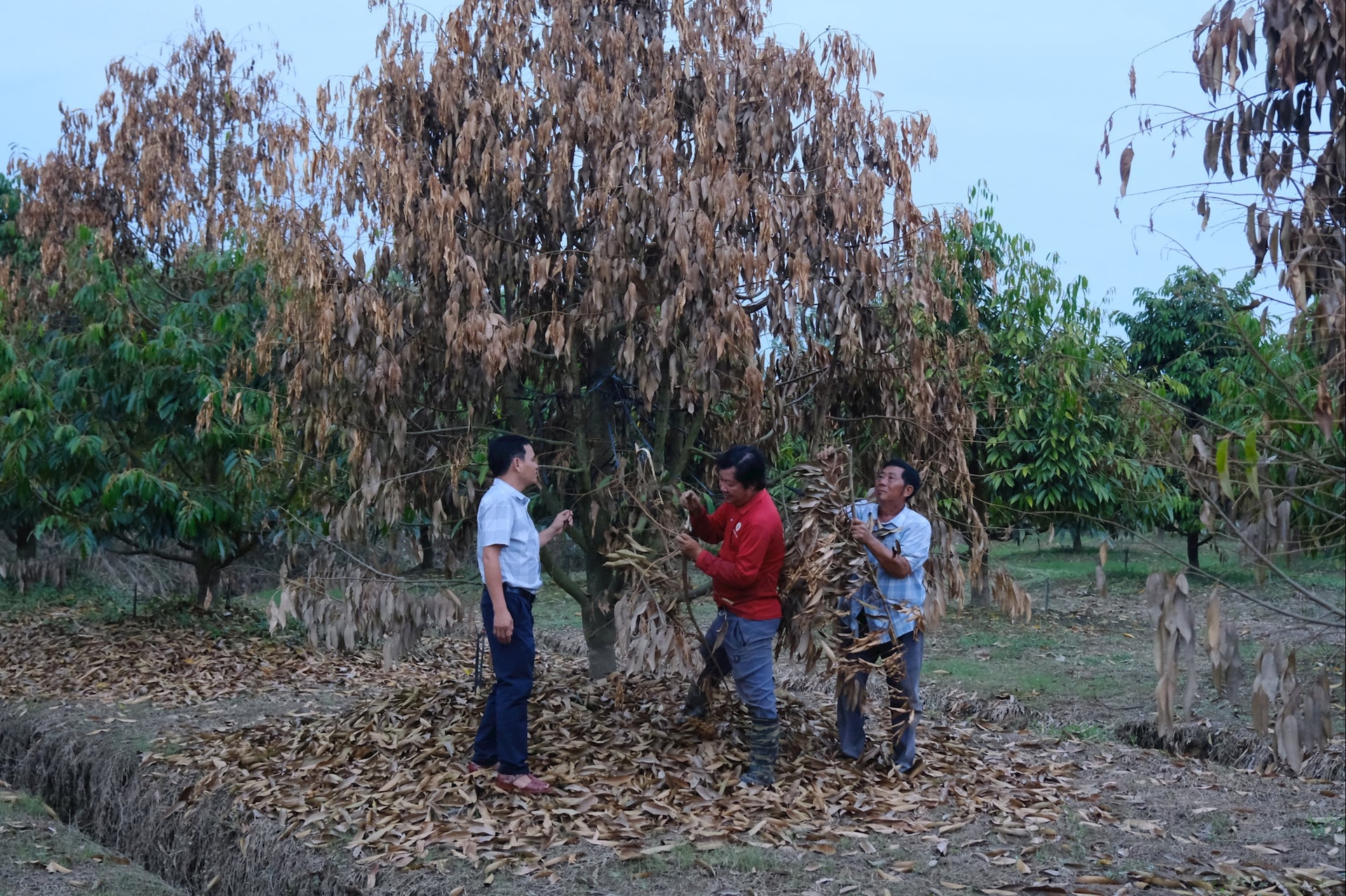 Nông dân tích cực dọn vệ sinh vườn, tạo độ thông thoáng cho cây sầu riêng