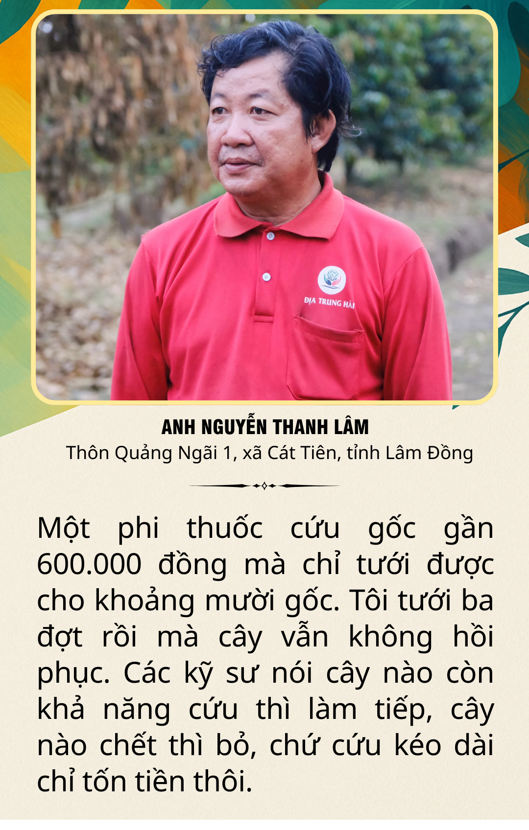 Người đàn ông rời Đồng Nai lên Cát Tiên lập nghiệp cho biết, những ngày qua gia đình đã cố gắng cứu cây bằng mọi cách. Anh đi nhiều cửa hàng vật tư nông nghiệp, nhờ cả những kỹ sư quen ở miền Tây lên xem vườn, đo đất, xem từng đọt cây để tìm cách giữ lại những cây còn hy vọng. Tuy nhiên, chi phí bỏ ra lớn mà kết quả vẫn mờ mịt.
