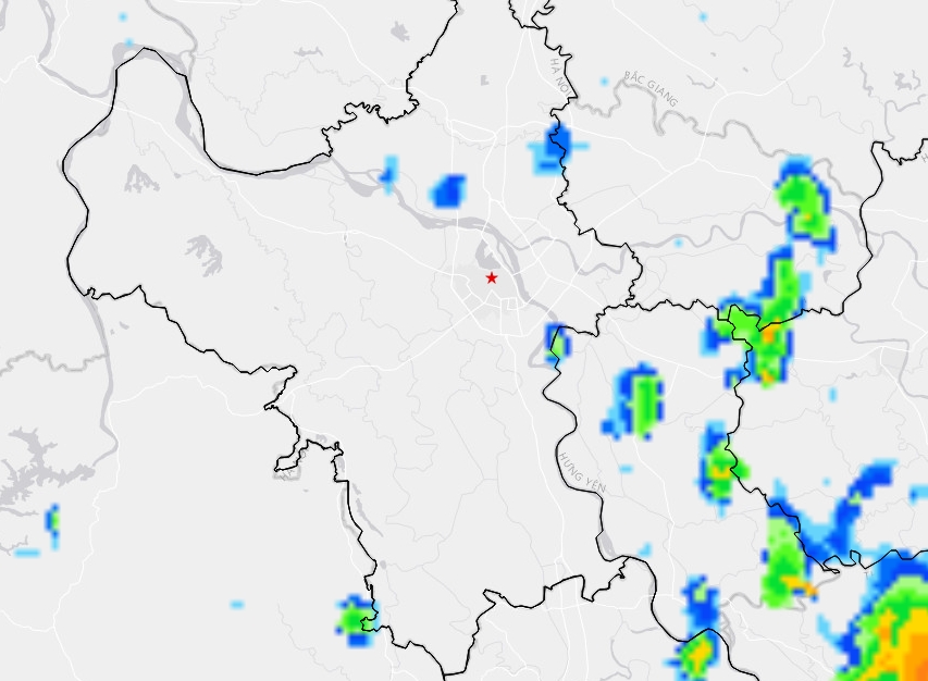Theo dõi qua ảnh vệ tinh, số liệu định vị sét và ảnh ra đa thời tiết cho thấy vùng mây đối lưu đang phát triển mạnh trên khu vực Hoàng Long, Nguyễn Văn Linh, Việt Yên (Hưng Yên); Lĩnh Nam, Bát Tràng (Hà Nội) và đang có xu hướng di chuyển về phía khu vực nội thành Hà Nội.
