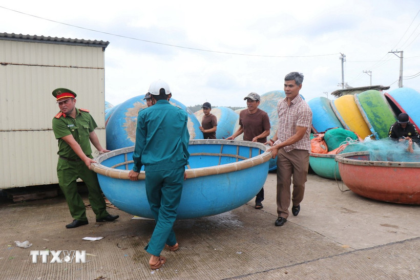 Hàng trăm phương tiện thuyền thúng được di dời lên bờ kè ứng phó với bão số 12. (Ảnh: Phạm Cường/TTXVN)