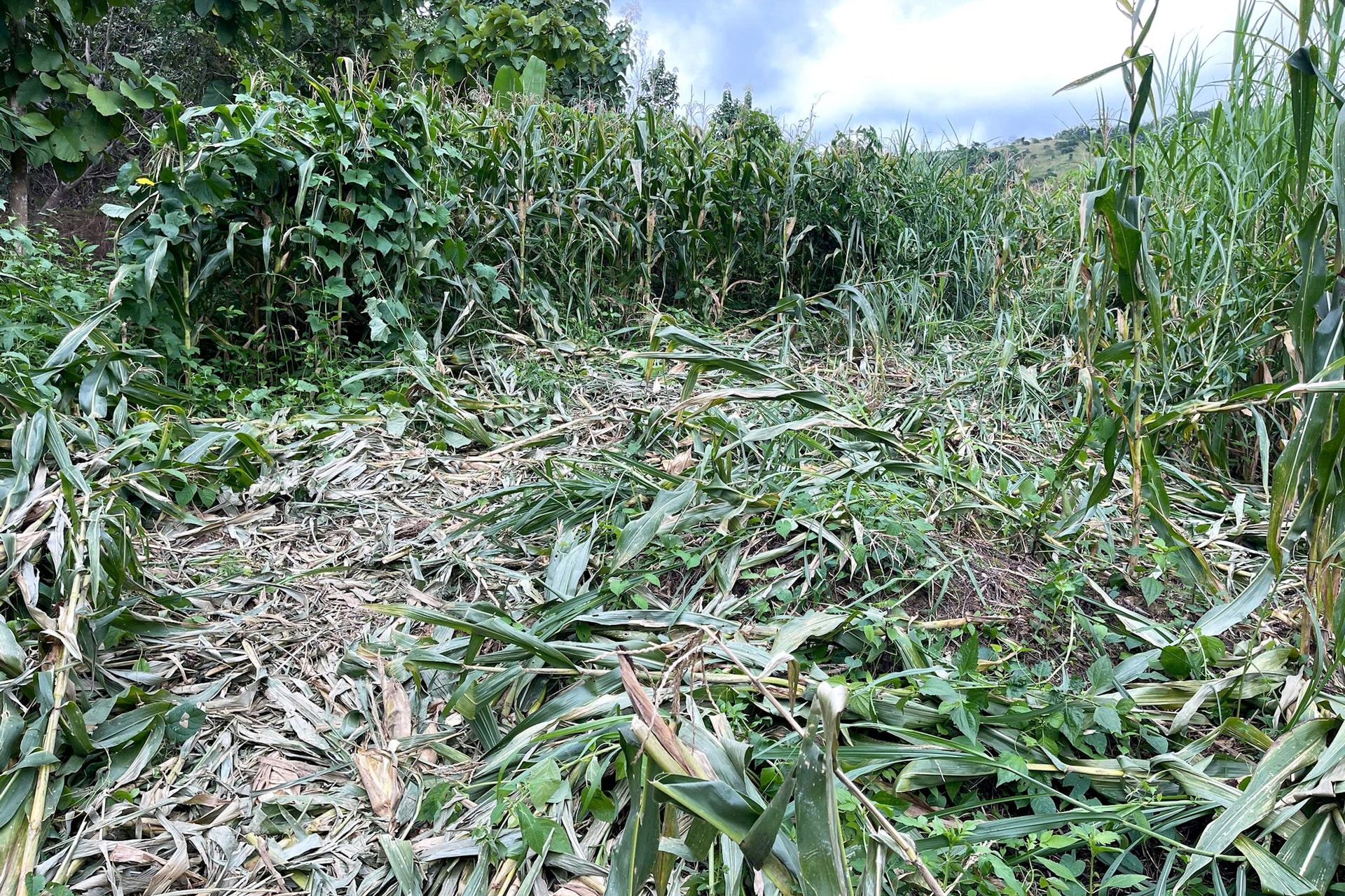 Cây cối của người dân xã Đắk Wil bị đổ rạp do voi rừng đi qua
