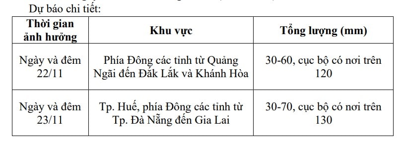 Dự báo, ngày và đêm 23/11, khu vực TP. Huế và phía Đông các tỉnh từ TP. Đà Nẵng đến Gia Lai có mưa vừa, mưa to, cục bộ có nơi mưa rất to với lượng mưa phổ biến từ 30- 70mm, cục bộ có nơi trên 120mm. Cảnh báo nguy cơ mưa có cường độ lớn hơn 80mm/3h.