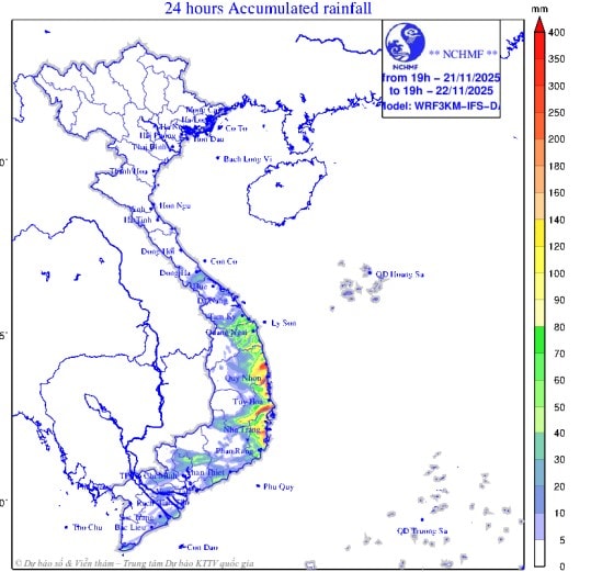 Trung tâm Dự báo khí tượng thủy văn Quốc gia cảnh báo, ngày 24/11, ở TP. Huế và phía Đông các tỉnh từ TP. Đà Nẵng đến Gia Lai có mưa vừa, mưa to với lượng mưa phổ biến từ 20-40mm, cục bộ có nơi mưa rất to trên 70mm.